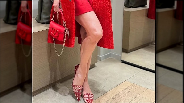 A perk of being Jennifer Lopez is having an endless supply of designer picks, with Valentino being one of her top faves. In 2019, she was seen rocking the iconic studded pumps — this time in a gorgeous satin nude shade with slingback heels, per Popsugar. To highlight her shoes, Lopez carried a Rockstar handbag in a blush pink that went perfectly with her neutral 'fit. In 2023, the mom of two wore an all-Valentino outfit yet again, with an eye-catching leopard print mini dress, glistening tights, and matching heels, Cosmopolitan reported.