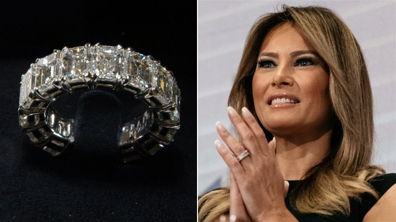 When Donald Trump and Melania tied the knot in 2005, of course, it was a lavish affair. Hello! reported the big day, which took place at Mar-A-Lago, may have cost as much as $2.5 million — so it's no surprise Melania got a pricey wedding ring to match. According to Irish Star, Melania's nuptial jewelry was designed by British jeweler Laurence Graff and features 13 carats worth of emerald-cut diamonds. "In 2005, this ring's price was $380,000; however, today, this translates to $580,000," Prestige Pawnbrokers' Alexandra Michell said in 2025, making it even more expensive than Melania's priciest outfits.