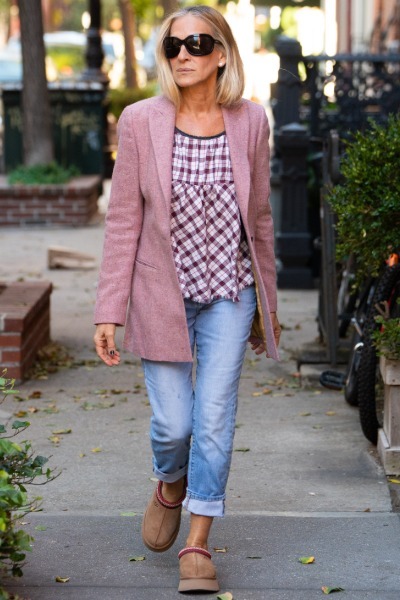 You could also take inspo from the celebs we've seen jumping on the blazer-and-jean revival. Claudia Schiffer paired a tweed blazer with dark wash jeans and pointed-toe suede shoes in October, while that same month, the ever-stylish Sarah Jessica Parker put her own twist on the look. She paired a long-line, light pink blazer with suede, platform mules, and rolled-up jeans to create a comfortable but far from stuffy look.
