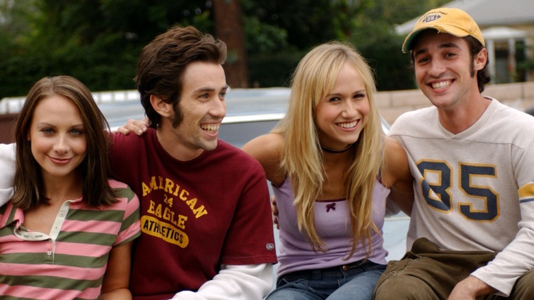 On "Yellowstone," Jennifer Landon plays Teeter, a ranch hand whose rebellious streak is perhaps best symbolized by her short, pink hair. In real life, though, as well as past roles, Landon has rocked a much different beauty style. Compared to her high-profile "Yellowstone" look, she's nearly unrecognizable in a snap from the set of the 2002 film "LA D.J." Sitting alongside cast mates Stacy Bellew, Tim Scarne, and Thomas Ian Nicholas, Landon has a feathered, side-part style with bangs — the kind of layered haircut that adds volume and dimensions.