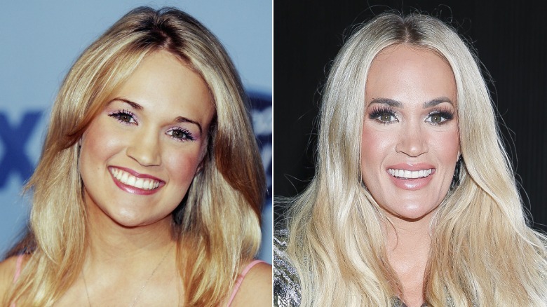 Like many stars, Carrie Underwood is no stranger to plastic surgery rumors, but some fans claim she has become unrecognizable since her early days on "American Idol." Underwood rose to fame in 2005 after winning season four of the singing competition. Since then, she's held onto her star status in the world of country music. And, in a fitting decision, she became a judge on "American Idol" in 2025, replacing Katy Perry. Clearly, she's come a long way, but so has her look, hence the fan speculation about plastic surgery.