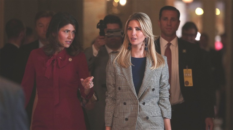 By 2017, Kristi Noem had earned Donald Trump's stamp of approval during his first term as president for showing her support for many of his extreme initiatives, such as the infamous Muslim travel ban. This championing of ultra-right-wing ideas coincided with a noticeable shift in her style that no longer felt so dated. Perhaps it was spending more time with powerful ladies like Ivanka and Melania Trump, who have long reflected a more refined and city-chic sensibility, that caused Noem to ditch the bootcut pants and busy prints in favor of cleaner silhouettes and solid-color dresses that seemed more polished and modern.