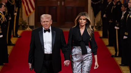First lady Melania Trump did not impress with her choice of silver pants while hosting the annual National Governors Dinner and Reception at the White House with husband Donald Trump on February 21, 2026. As expected, the black tie event called for formal evening dress. The president adhered to the style code with a black tuxedo, but Melania missed the mark by wearing pants, a silver belt, and a black blouse.