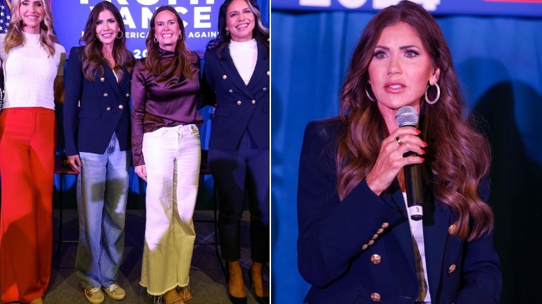 The old adage says you should dress for the job you want, but Kristi Noem has taken professional dressing further than most. Her version of workwear tends to involve suits and jackets made from heavy materials and featuring gaudy hardware. It's all a bit opulent, and leaves her looking like she never moved past an '80s sense of style. In particular, she leans heavily on a retro, highly gendered style of suiting, from her choice of fabrics to more feminine silhouettes. "It almost seems like a statement that there is a place for women in conservative circles, but only as women — a fashion and aesthetic rejection of efforts on the left toward gender equality or even gender neutrality," Peggy Heffington, history professor and author of "Without Children: The Long History of Not Being a Mother," told the HuffPost.